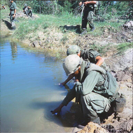 We were all ordered to fill up on water at every opportunity. Many casualties were due to heat stroke which could be fatal. It was at or over 100 degrees. We were told that a lot of those suffering heat stroke were “shitbirds” who were too lazy to carry enough water and suffered the consequences. At each water stop, squad and platoon leaders checked our gear to see that all of our canteens were full.