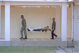 Wished I could have walked into the hospital, but safety requirements mandated being in a stretcher. There was an urgent need to eat or dash to the toilet, but I had no freedom to go anywhere, nor did I know where anything was. We were taken to the Orthopedic Ward and put into a bed. Eventually, the walking wounded and some marines in wheelchairs were escorted to the mess hall which was huge. It was challenging walking with an IV pole and carrying a food tray through the food line, but the motivation was there. The food was plentiful and delicious. The marines at our table were bitching about how these Navy folks get such great food and we had been fed garbage. A few guys were talking about how lucky we were right now to be out of the bush. Some reported seeing a plane at the air base unloading caskets.