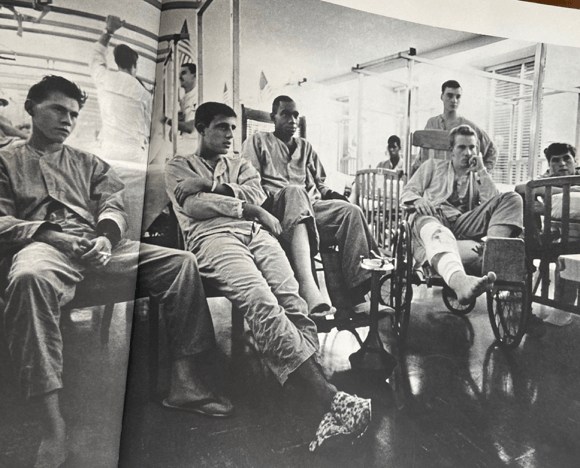 I never found out what happened to the photos and mostly forgot about them. There was no way to know where they landed. Then, I ran into one of my friends from Great Lakes Hospital, Danny Mallman. He was another lucky marine with a million dollar wound. We passed on the sidewalk on the North Side of Chicago in the late 70s. He told me that the pictures were in Duncan’s book, “War Without Heroes”. I spent many years searching for this book and eventually gave up. The Dewey Decimal System wasn’t working for me. I did find a copy of the book in the late 80’s, (Barbara Gilbert), but the photos weren’t in it. When I started writing about my Marine Corps experience, I did more research on Duncan. I found his book about the 1968 Democratic Convention, “Self Portrait: USA”. I contacted an Amazon vendor who had it for sale. He verified that the book had photos of marines in the hospital. Bingo! Amazon did the rest.